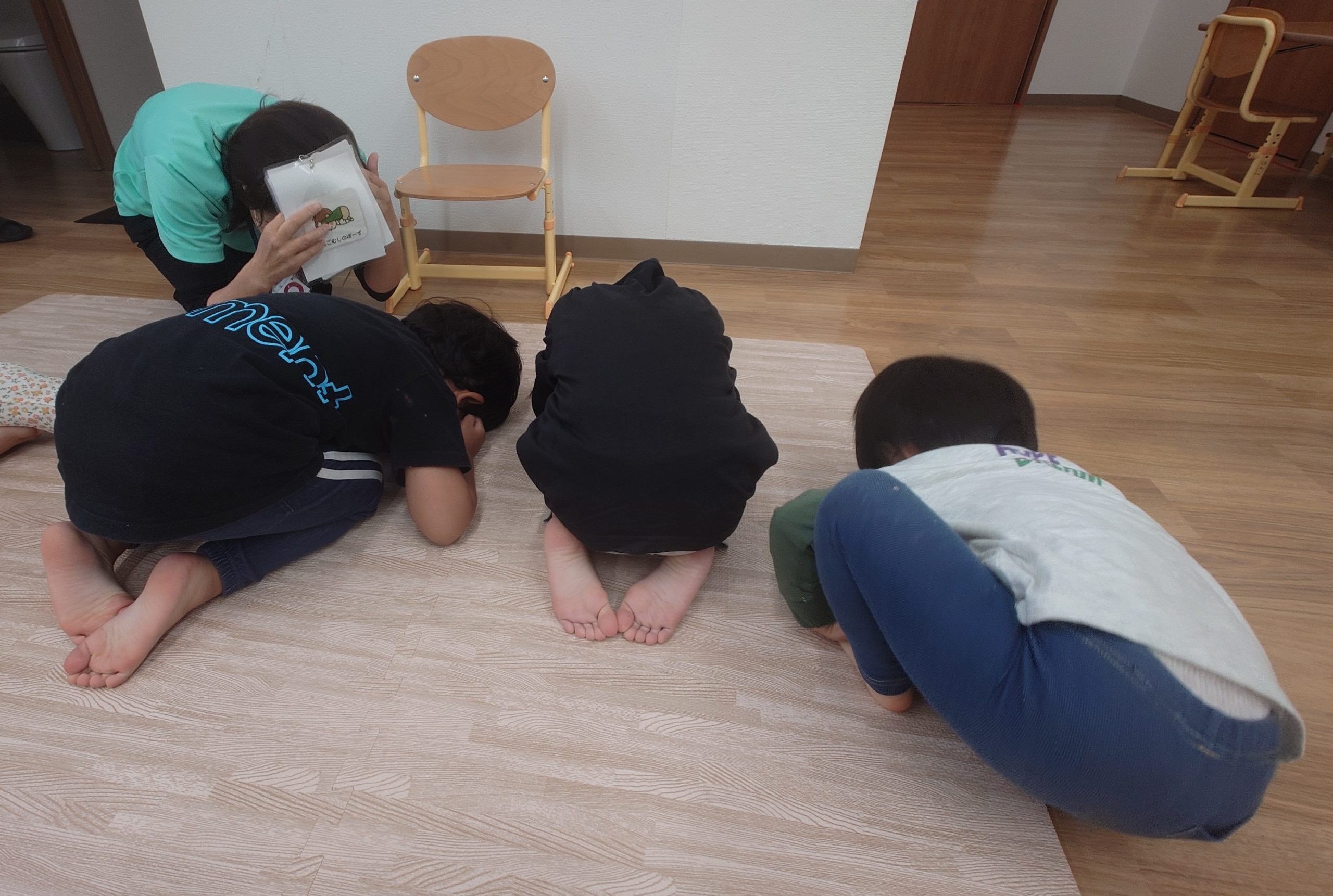 「頭を守る」ことのお話を聞いて、みんなで“だんごむしのポーズ”を練習したあとに玄関まで避難しました。